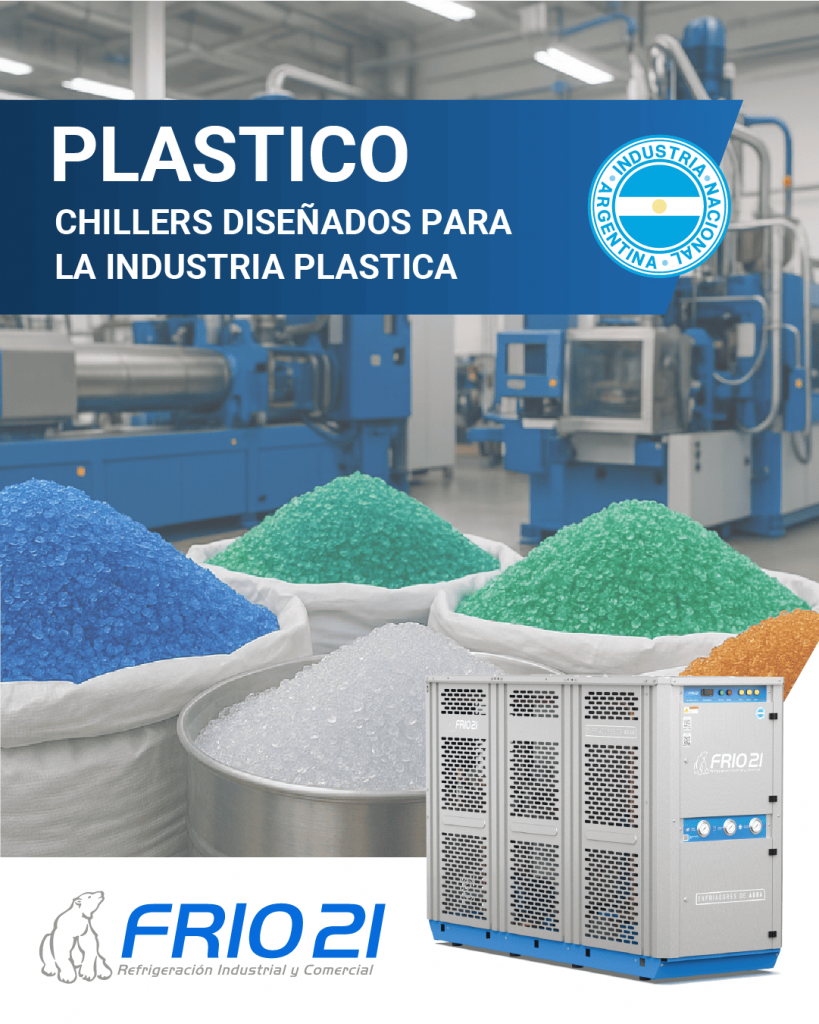 Soluciones de refrigeración industrial para la industria plástica FRIO NEWS La industria plástica requiere sistemas de refrigeración industrial eficientes, precisos y adaptables. En Frío 21 entendemos que cada proceso desde la extrusión, el moldeo por inyección y hasta el soplado necesitan una solución de enfriamiento específica para garantizar calidad, continuidad operativa y ahorro energético. Nuestros chillers para industria plástica están diseñados a medida para cubrir esas exigencias, cumpliendo con normativas de seguridad, higiene y eficiencia técnica, y respaldados por un equipo con más de 25 años de experiencia en el rubro. ¿Por qué la refrigeración es clave en la industria plástica? Durante la transformación del plástico, el control de temperatura es esencial para asegurar la estabilidad del producto final. Ya sea en la fabricación de envases, piezas técnicas o productos de consumo, un enfriamiento inadecuado puede generar deformaciones, tiempos de ciclo ineficientes o fallas en la calidad del material. Por eso, incorporar un chiller industrial en tu proceso no solo mejora el rendimiento de tus máquinas, sino que también: Reduce tiempos de enfriamiento Aumenta la vida útil de los moldes Optimiza el consumo de energía Mejora la calidad del producto final Soluciones personalizadas y escalables En Frío 21, cada chiller es diseñado en base a las necesidades particulares de tu planta. Realizamos un análisis del proceso, caudal, temperatura objetivo y disponibilidad de espacio para ofrecerte un sistema a medida, que puede ser escalable a medida que tu producción crece. Nuestros equipos se destacan por: Alta eficiencia energética Componentes de calidad internacional Sistemas modulares, ideales para escalar según demanda Diseño industrial robusto y compacto Compatibilidad con normas nacionales e internacionales Podés conocer más sobre nuestra línea de chillers industriales o explorar otras soluciones por industria. Soporte técnico especializado para cada proceso Sabemos que no todos los procesos son iguales. Por eso, además de fabricar, asesoramos, instalamos y damos soporte técnico continuo. Ya sea en la puesta en marcha o en el mantenimiento preventivo, nuestro equipo está capacitado para atender industrias plásticas de todo el país y brindar asistencia remota cuando sea necesario. Conocé más sobre nuestros servicios de instalación y mantenimiento o escribinos para recibir una cotización. ¿Estás buscando un chiller para tu planta plástica? Si trabajás con extrusoras, inyectores, sopladoras o cualquier otro proceso que requiera control térmico, podemos ayudarte. En Frío 21 desarrollamos chillers para industria plástica que se adaptan a tu operación, cumpliendo con todos los requisitos técnicos y aportando valor real a tu proceso productivo. Contactanos hoy mismo y descubrí cómo mejorar la eficiencia de tu sistema de refrigeración industrial. Contactanos hoy mismo para cotizar tu chiller Contacto Equipos recomendados para esta aplicación: Conocé más MIC – Minichillers Están diseñados para cubrir bajas capacidades frigoríficas. Son ideales para cualquier industria que requiera poca potencia, pero con alta prestaciones y confiabilidad…. MEC – Chillers medianos Están diseñados para cubrir las capacidades frigoríficas promedio de la mayoría de las industrias. El 70% de los procesos que requieren enfriamiento están cubiertos en esta familia de equipos. Conocé más GRC – Grandes chillers Están diseñados para cubrir grandes capacidades frigoríficas gracias a la modularidad del sistema se puede ir aumentando la capacidad instaladas al ir incrementando la cantidad de modelos. Conocé más TMIC – Minichillers con tanque incorporado. Están diseñados para cubrir bajas capacidades frigoríficas. Son ideales para blisteras, máquinas de grabado láser y cualquier industria que requiera poca potencia, pero con alta prestaciones y confiabilidad. Conocé más TMEC – Chillers medianos con tanque incorporado. Están diseñados para cubrir un gran espectro de capacidades frigoríficas. Son ideales para el enfriamiento de procesos puntuales como puede ser inyectoras de plastico. Conocé más