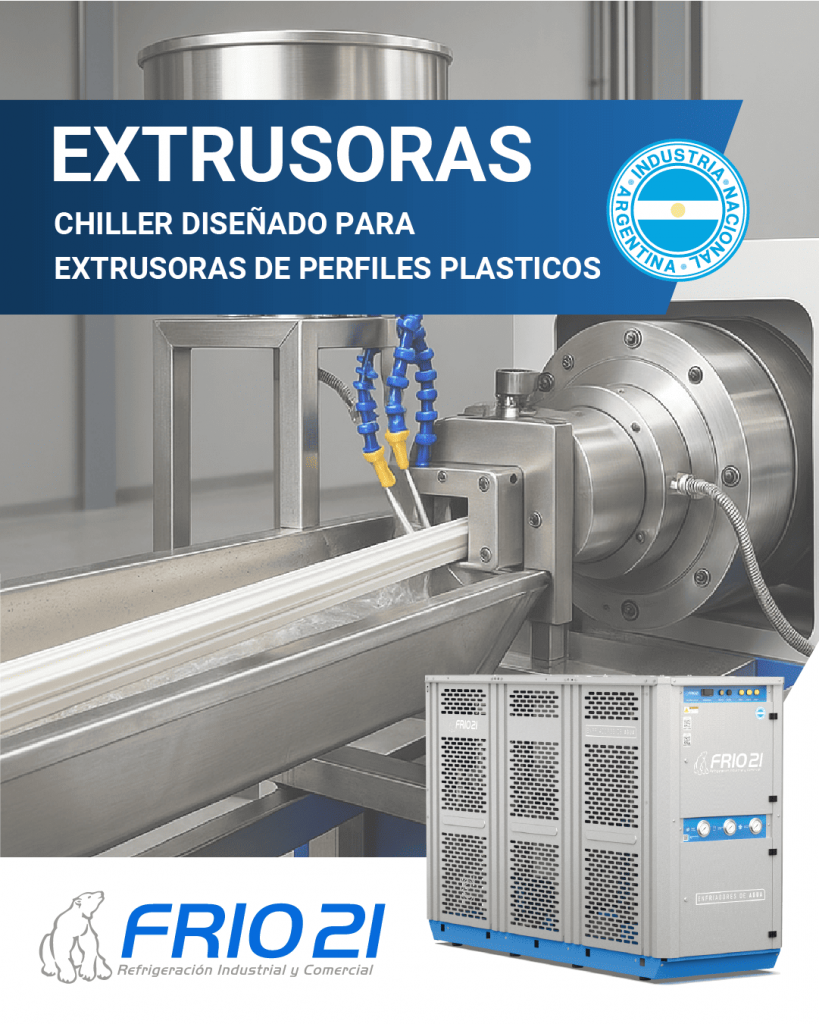 Agua fría para extrusoras plásticas: cómo mejorar la calidad del producto final y evitar deformaciones FRIO NEWS Durante el proceso de extrusión, el plástico fundido atraviesa altas temperaturas y luego debe solidificarse rápidamente al salir del cabezal. Este enfriamiento es determinante para lograr piezas con buena terminación, sin defectos ni deformaciones. Por eso, contar con un sistema de agua fría para extrusoras plásticas es clave para garantizar un proceso productivo eficiente, estable y continuo. En Frío 21 desarrollamos chillers industriales diseñados para procesos de extrusión, con capacidad de enfriar el agua de forma precisa, constante y adaptada al tipo de plástico trabajado. ¿Por qué es tan importante la refrigeración en extrusión? Si el agua de enfriamiento no tiene la temperatura adecuada o no se mantiene estable durante todo el ciclo, pueden aparecer: Deformaciones en la pieza extruida Cambios en la geometría por contracciones irregulares Rayas, burbujas o grietas superficiales Tiempos de ciclo más largos y pérdida de productividad Un chiller enfriador de agua mantiene el circuito de refrigeración a la temperatura justa, incluso en producciones continuas y exigentes. Ventajas de usar agua fría con chiller en extrusoras plásticas Mayor control sobre la calidad del producto final Mejora en la estabilidad dimensional de las piezas Reducción del scrap o rechazos Mayor vida útil del equipo y de los moldes Optimización de tiempos de ciclo Si querés conocer más sobre este tipo de soluciones, visitá nuestra sección de chillers para industria plástica. Sistemas de refrigeración hechos a medida Cada extrusora tiene sus particularidades. En Frío 21 analizamos: Caudal necesario de agua fría Carga térmica del proceso Tipo de plástico trabajado (PEAD, PVC, PP, etc.) Condiciones del entorno Integración con sistemas existentes También podés ver nuestra línea general de enfriadores de agua industriales, pensados para procesos exigentes y 100% fabricados en Argentina. Mantenimiento y soporte técnico para extrusión Ofrecemos servicios completos de instalación, puesta en marcha y mantenimiento preventivo. Conocé más sobre nuestros servicios de mantenimiento y asegurá la continuidad operativa de tu planta. ¿Buscás una solución de agua fría para extrusoras plásticas? Con más de 24 años de experiencia en refrigeración industrial, Frío 21 ofrece soluciones confiables, eficientes y adaptadas a cada necesidad. Contactanos hoy mismo y recibí asesoramiento personalizado sin cargo. Contactanos hoy mismo para cotizar tu chiller Contacto Equipos recomendados para esta aplicación: Conocé más MIC – Minichillers Están diseñados para cubrir bajas capacidades frigoríficas. Son ideales para cualquier industria que requiera poca potencia, pero con alta prestaciones y confiabilidad…. MEC – Chillers medianos Están diseñados para cubrir las capacidades frigoríficas promedio de la mayoría de las industrias. El 70% de los procesos que requieren enfriamiento están cubiertos en esta familia de equipos. Conocé más GRC – Grandes chillers Están diseñados para cubrir grandes capacidades frigoríficas gracias a la modularidad del sistema se puede ir aumentando la capacidad instaladas al ir incrementando la cantidad de modelos. Conocé más TMIC – Minichillers con tanque incorporado. Están diseñados para cubrir bajas capacidades frigoríficas. Son ideales para blisteras, máquinas de grabado láser y cualquier industria que requiera poca potencia, pero con alta prestaciones y confiabilidad. Conocé más TMEC – Chillers medianos con tanque incorporado. Están diseñados para cubrir un gran espectro de capacidades frigoríficas. Son ideales para el enfriamiento de procesos puntuales como puede ser inyectoras de plastico. Conocé más